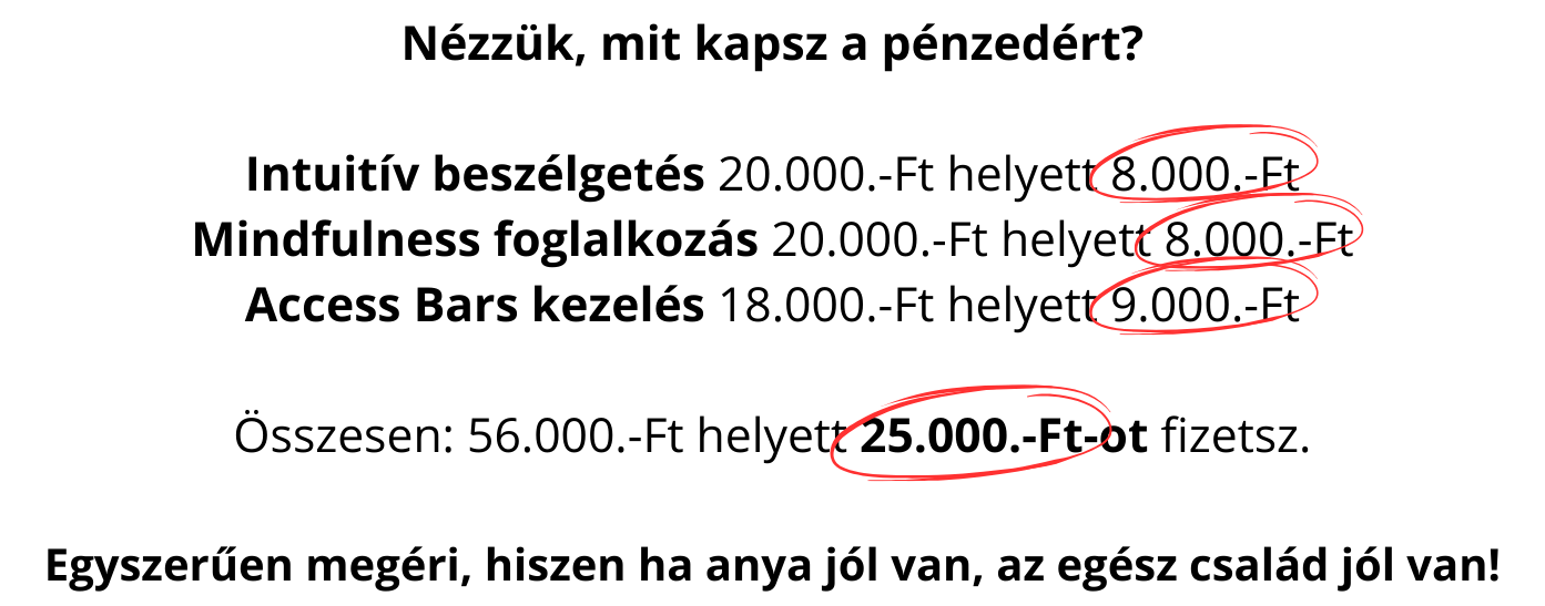 Ez a program háromszoros támogatás egyetlen alkalom alatt – anyáknak, akik végre szeretnének fellélegezni, szeretnék a mindennapokat könnyedebben megélni, és szeretnék csökkenteni a stresszt az életükben, hogy újra kiegyensúlyozottan, türelmesen és önmagukhoz kapcsolódva élhessék a napjaikat.